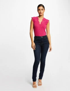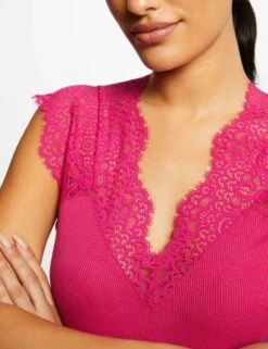 Empiècements dentelle guipure ton sur ton avec bord festonné et franges au niveau des bretelles et de l¿encolure