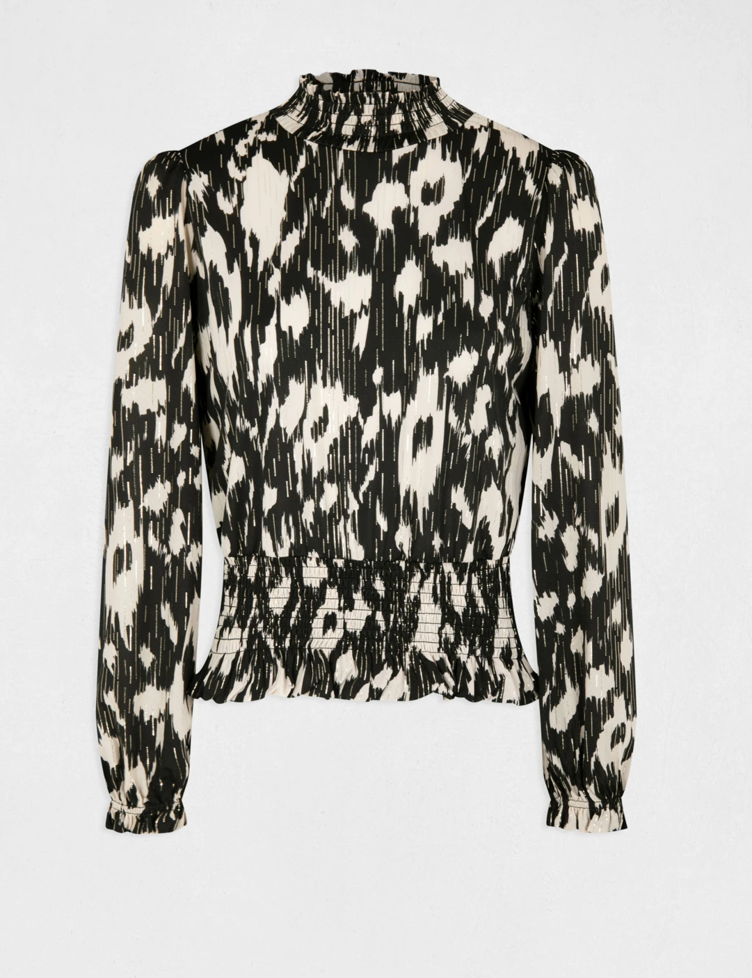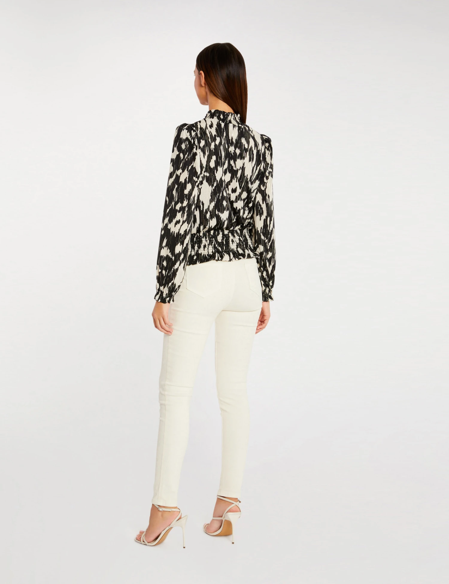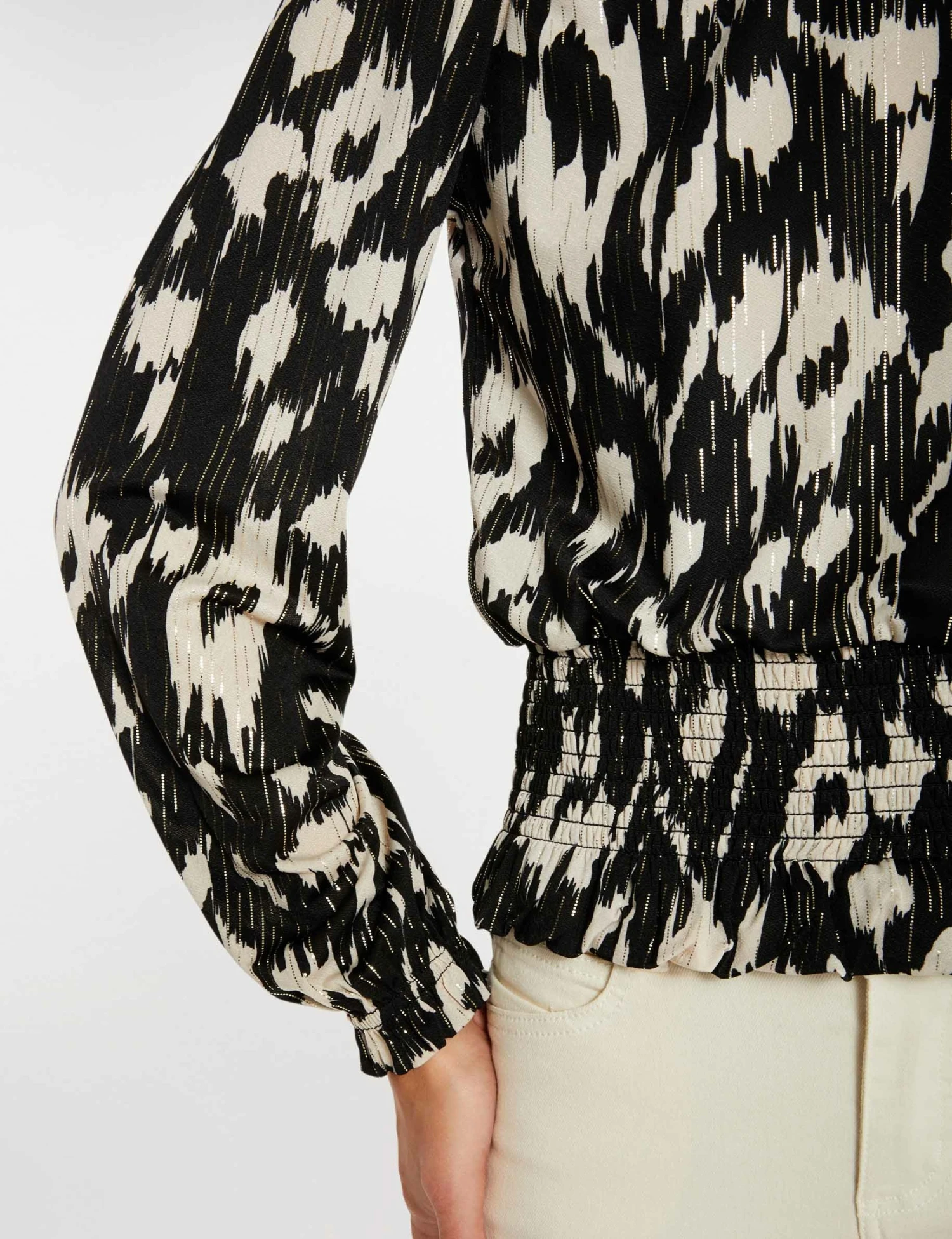 DĂ©tails plissĂ©s sur le buste, sur les manches et Ă l’encolure